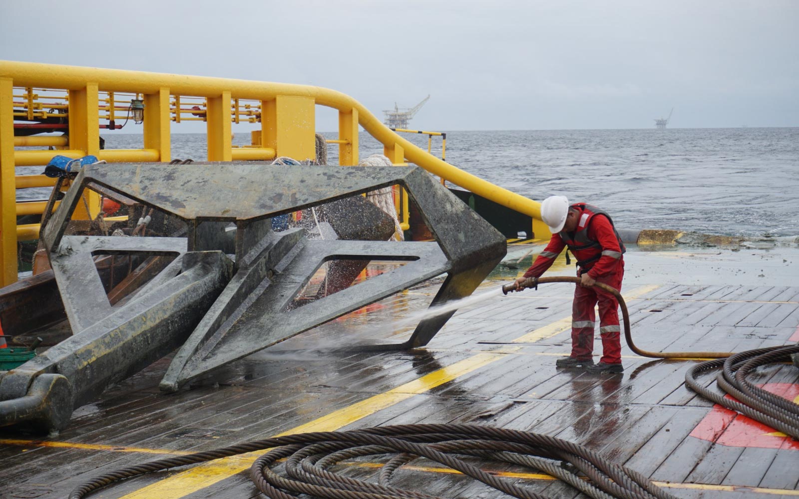 Deep water anchor handling operations in challenging 1,200m water depths, demonstrating our advanced marine support capabilities.